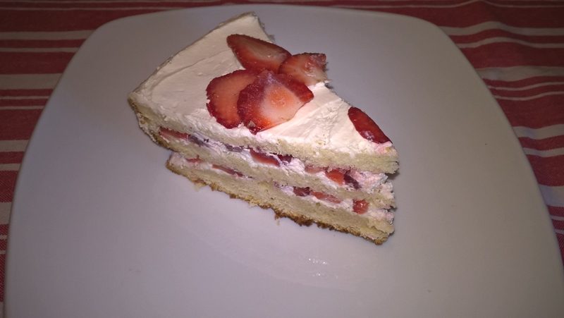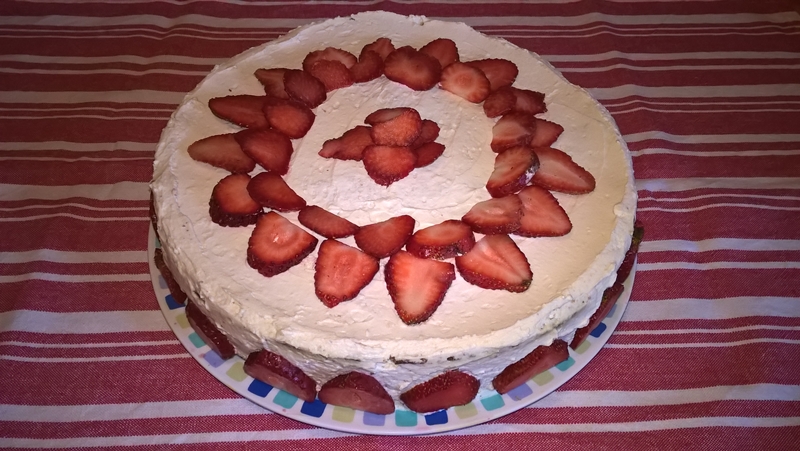Se taie blatul în trei părți. Se pune marginea detașabilă de la tava folosită pentru blat pe un platou. Se așează prima foaie de blat și se însiropează cu o treime din sirop, se pune crema și se presară jumătate din căpșunile tăiate cubulețe. Se continuă cu al doilea strat, se însiropează, se pune crema și căpșunile rămase. Se pune ultimul nivel, se însiropează și se pune o parte din crema rămasă nivelând ușor (se oprește puțină cremă pentru a tapeta marginile tortului ulterior). Se dă platoul la frigider până a doua zi. Se detașează marginea de la tavă, se adaugă crema rămasă pe largini și se ornează cu căpșuni.
