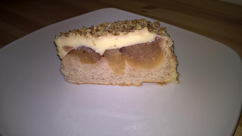 Se separă albușurile de gălbenușuri. Se bat albușurile spumă cu un praf de sare și 75g. de zahăr. Se încorporează gălbenușurile cu o spatulă cu mișcări ușoare de jos în sus. Se adaugă scorțișoara și făina cernută etapizat. Se pune compoziția în tavă peste mere și se bate ușor tava pentru a se acoperi eventualele spații libere dintre mere. Se dă tava la cuptor pentru aproximativ 25 de minute (până trece testul scobitorii). Se oprește cuptorul și se lasă tava în cuptor cu ușa întredeschisă până se răcește (pentru a rămâne tortul bine aerat) – aproximativ o oră. Se răstoarnă tortul pe un platou (cu merele deasupra).